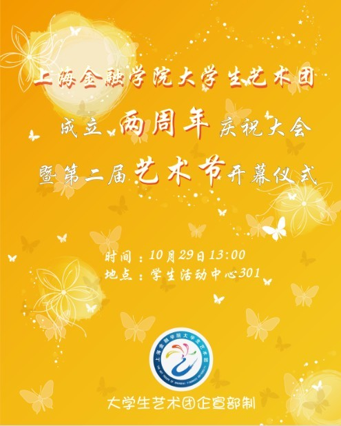 上海金融学院大学生艺术团成立两周年啦! 我们将于10月29日(本周二)13:00在学生活动中心301举办大学生艺术团成立两周年庆祝活动以及第二届艺术节开幕仪式。