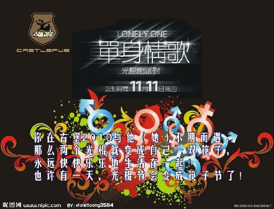 光棍节是一种流传于年轻人的娱乐性节日,以庆祝自己仍是单身一族为骄傲(“光棍”的意思便是“单身”)。11月11日,光棍节,源于这一天日期里有四个阿拉伯数字“1“形似四根光滑的棍子,而光棍在中文有单身的意思,所以光棍节是单身一族的一个另类节日,这个日子便被定为“光棍节”(One's Day)。光棍节产生于校园,并通过网络等媒介传播,逐渐形成了一种光棍节的文化。如今越来越多的人选在光棍节结婚,于此同时,也是各大商家以脱光为由打折促销的时期。.png)