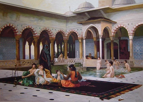 该画描绘了阿拉伯王宫最隐秘的后宫生活,描绘了生活于后宫的王妃、宫女等女眷的闺阁生活,有的在洗浴,有的在清谈,有的在沉思......不过作者想表达的内容不止于此,你能体会得到吗?