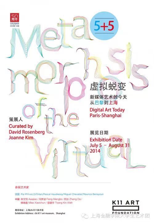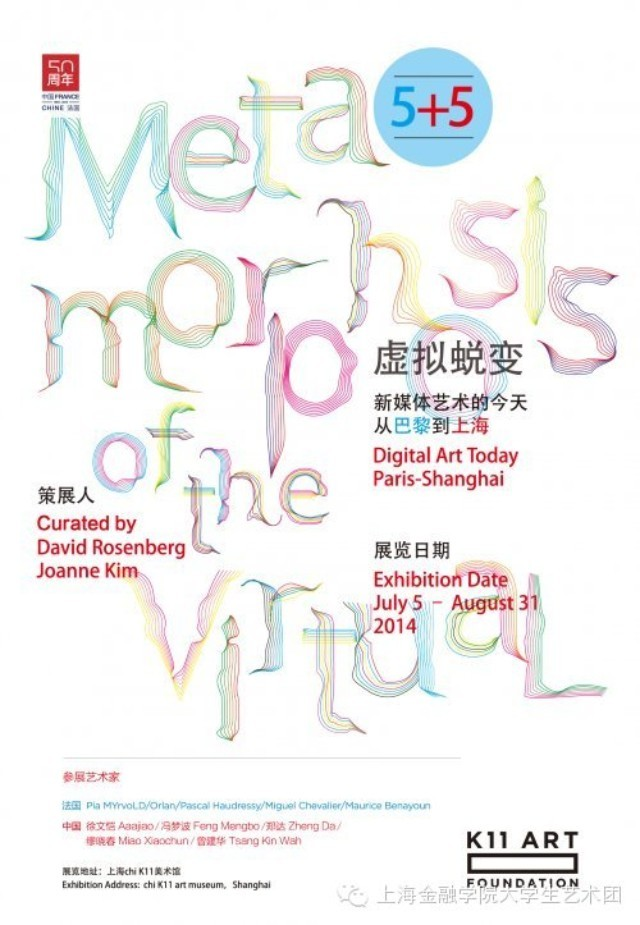 由K11 Art Foundation呈献,展览“虚拟蜕变 5+5” 将掀起中法数码艺术新浪潮。将展出10位来自中法两国的国际知名新晋艺术家之代表作,展览意在创造处一种艺术家与社会之间进行文化交流的新模式。