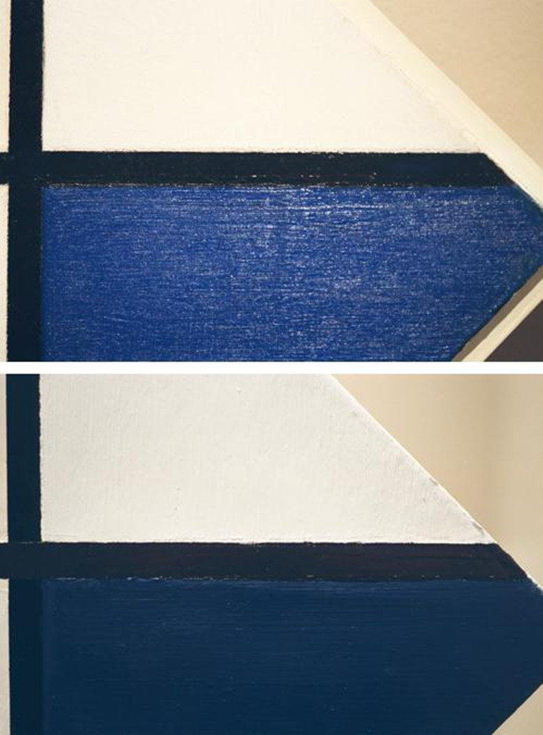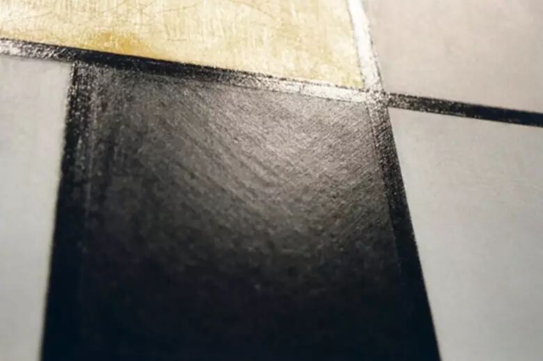 如果你蹲下身,逆光往上看这幅画——在展馆里是个很狡猾的办法,因为这样会暴露出画作的裂缝以及表面——从画布的纹理可以看出蒙氏画作中黑色长方形用的颜料较薄。而黄色色块使用的颜料就厚重多了。再凑近点看黄色区域能发现这个绘画表面相当丰郁,每个表面和线条都有它的纹理:条纹被刻出了脊线;一些表面,比如蓝色区域,有油漆工人试图避免的徒手画出来回刷笔的纹理痕迹。放在一起这幅画作有了丰富的表面纹理,艺术史学家称之为制作法。
