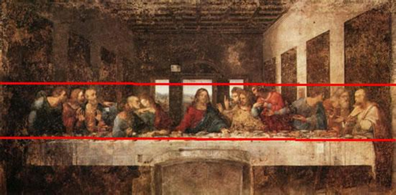 我们可以看到,这两幅整体都是运用平行辐射线式的构图,《最后的晚餐》里耶酥处在画面中心位置。正是因为平行线的轴心在视觉上自然集中的效果,因此画面中所有的人都紧紧地联系到了耶酥的身上。整排的人和前面长桌子形成平行的水平线,使之在构图中形成向两边展开的视觉感觉。这种视觉的引导使所有弟子的不同面貌、不同的心情、性格逐一呈现在观众面前,为充分刻画出每一个形象以及他们之间的联系提供了足够的空间。