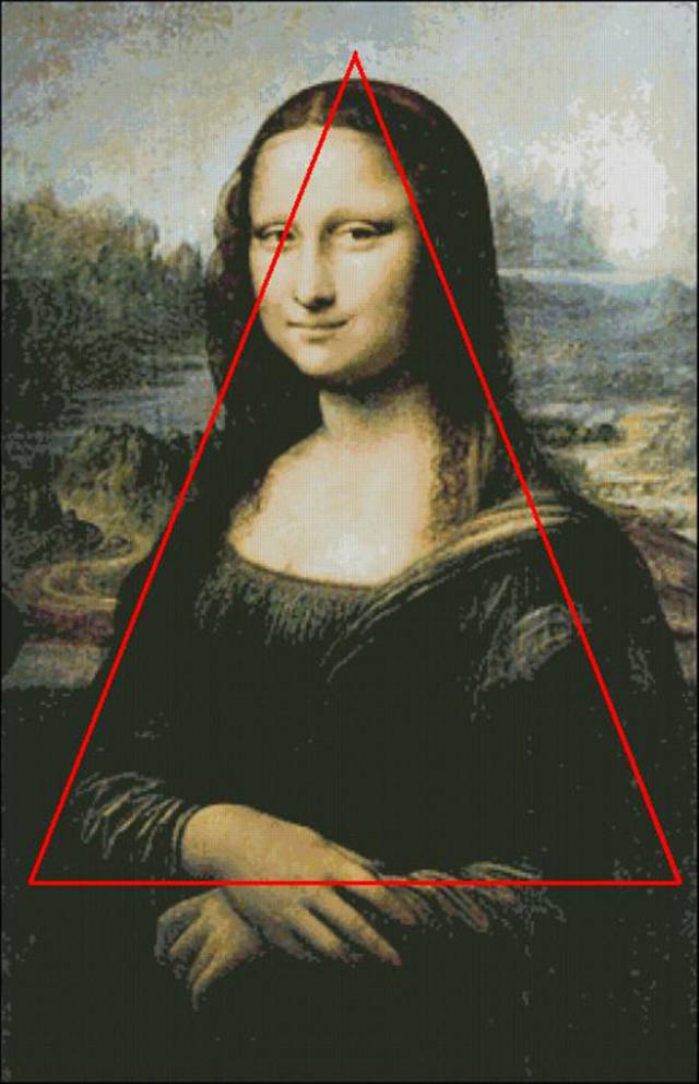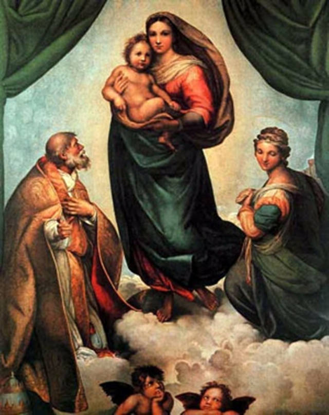 《西斯庭圣母》的画面结构看似简单,但是细看画面却同时运用了十字形和正三角形与圆形三种构图方式。从抱着耶酥的圣母到下面两个小天使的内在联系呈现十字架效果,使画面油然而生一种神圣庄严而不可侵犯的气氛。同时,圣母和教皇与摩达拉形成正三角形的视觉效果,画面人物上方的两块帷幕虽然显得有些古板却正好加强了这种三角形的效果,圣母那从容沉着,豁达大度的精神表情状态得到了唯美到位的表现。而放眼整幅作品几组人物形象又形成了一个椭圆形,因此起到了加强了各个形象之间的联系感。