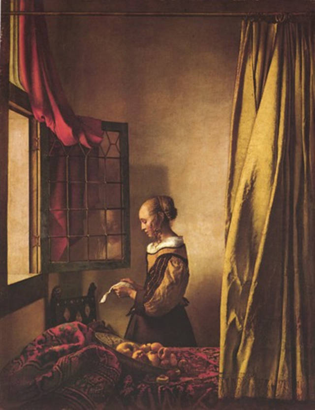格局虽小但却拥有丰富的表现力,巧妙平衡的构图让其显得更为优美而精准,其中光线的唯美应用创造了一种柔和、弥漫的氛围。维米尔对色彩的卓越把握体现的淋漓尽致,画面中运用的各种蓝色色调一定会让观众流连忘返。