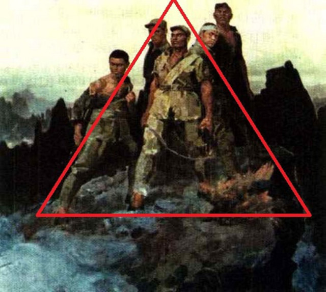 三角形构图,稳定感十足,《狼牙山五壮士》的仰视效果则增强了壮士宁死也不屈的刚毅之感和形成永恒的纪念碑式的稳定感,是不是赶脚就跟葫芦娃的葫芦山似的极富力量感。