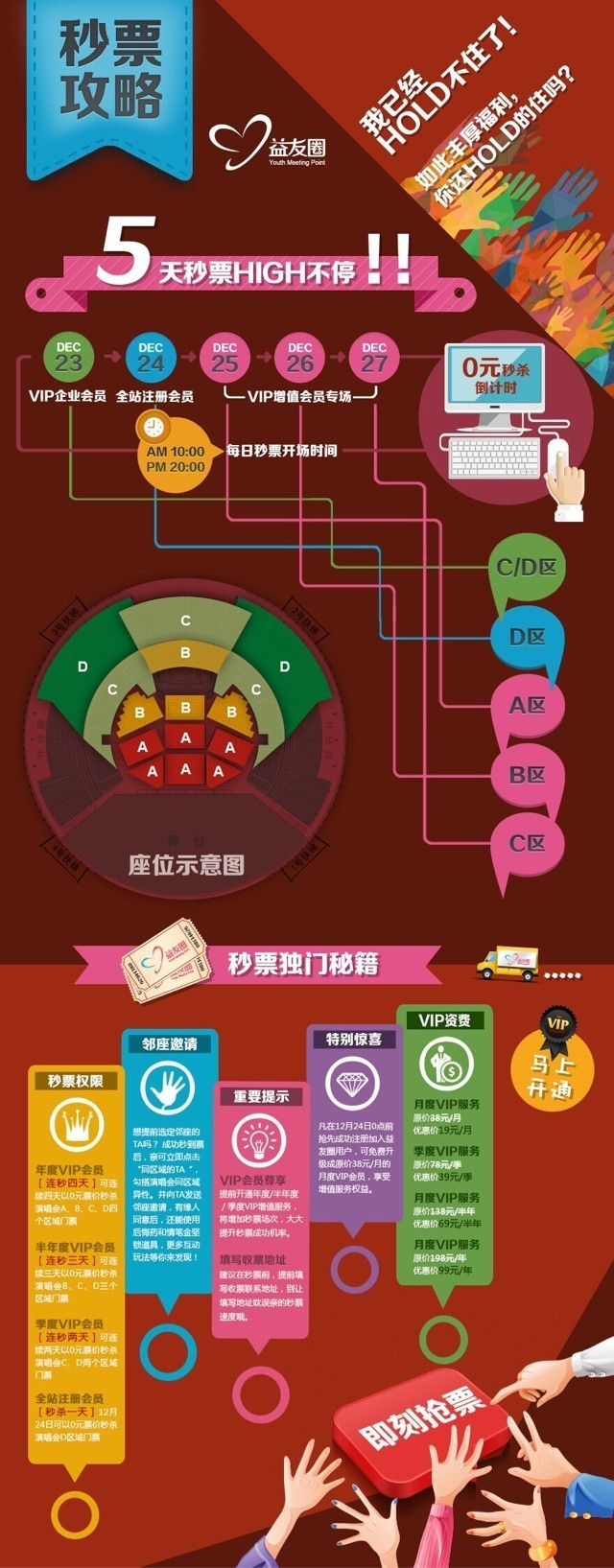 上海金融学院是益友圈vip合作企业,可以额外优先参与23日的企业专场秒票,我们给每家企业二维码都是不一样,申能的二维码ID是专属的,在社会上看到的包括地铁、分众传媒、户外商圈电子广告屏、高炮、道旗等等,都是面向全市社会青年二维码。金院的青年扫描海报上的二维码注册以后可以参加23,24日两天的秒票,其中23日为VIP合作企业青年专场,24日为全体注册会员秒票专场,每天分为上午和下午两场,2天共4场,如果没有秒中还可以自愿成为我们的增值会员,参加25,26,27三天的增值会员秒票专场。秒到的票是免费观看1.10演唱会的门票,不收取任何费用。