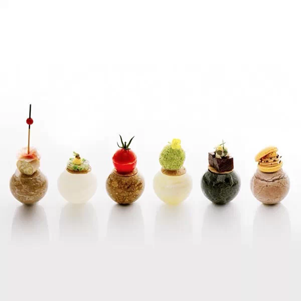 前菜小品,六种不同菜式端坐在圆球上,小巧可爱,从左到右常温、冷盘区分细致,每一口都是不同的体验