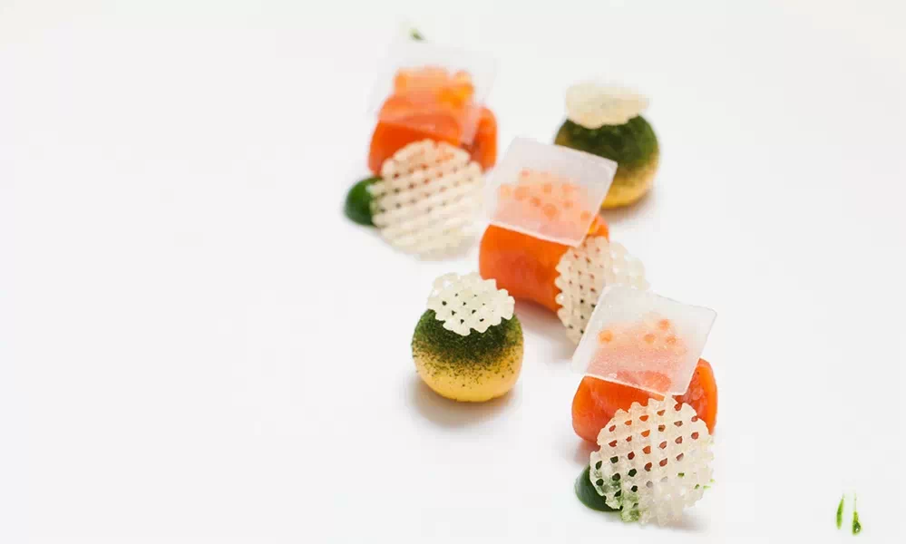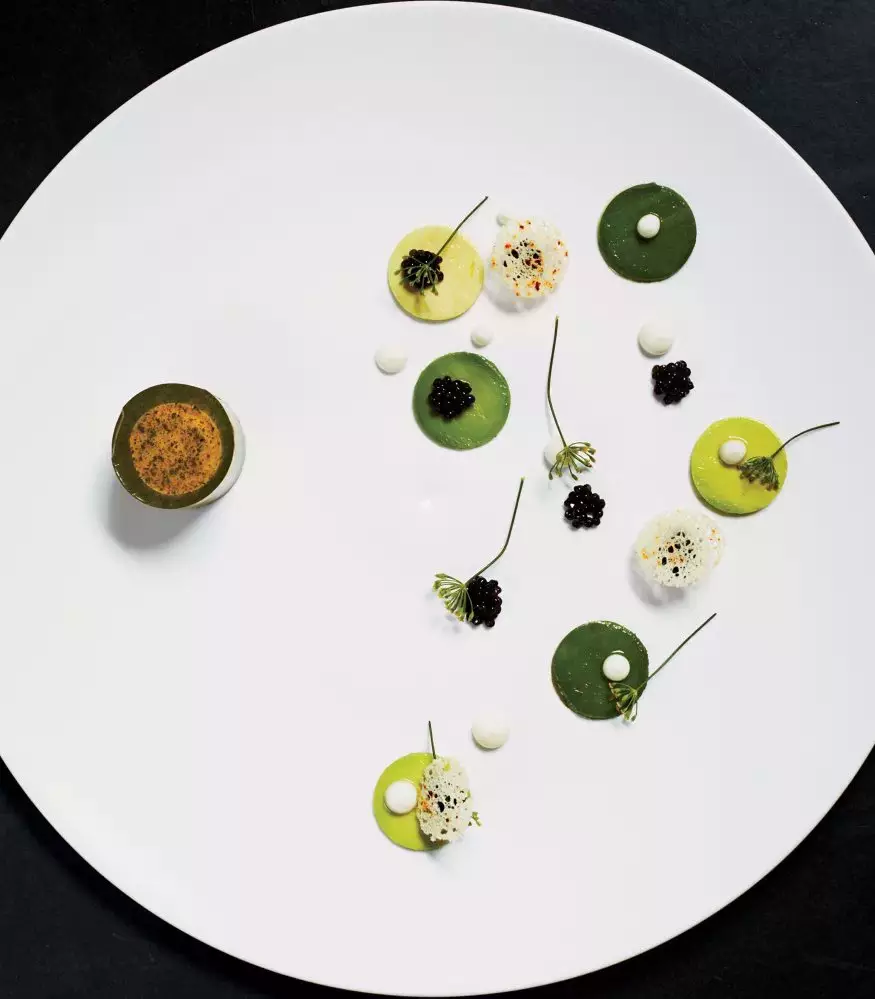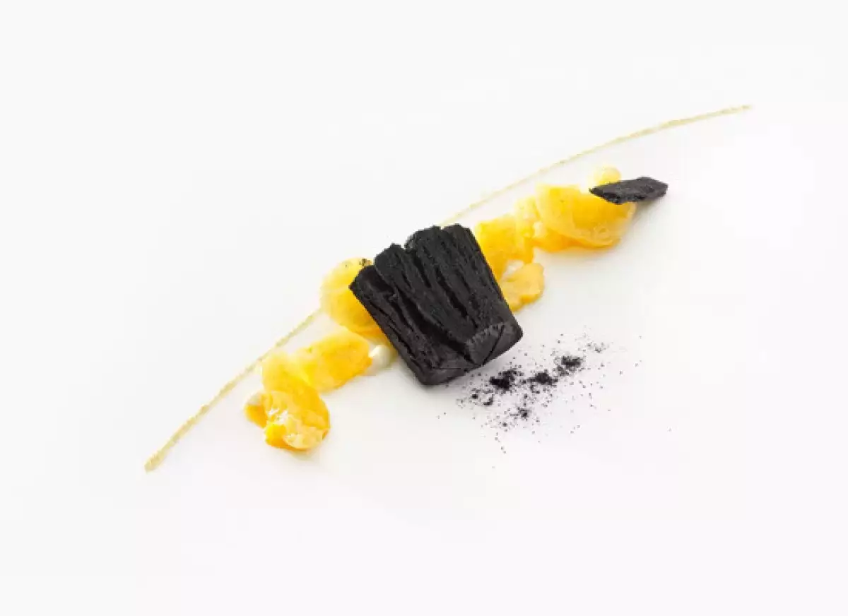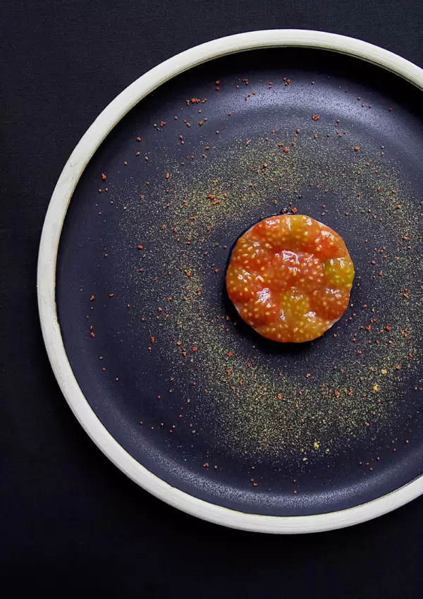 大西洋小龙虾卵点缀番茄,又是一个同心圆的摆盘方式,与黑色的盘子特别配。
