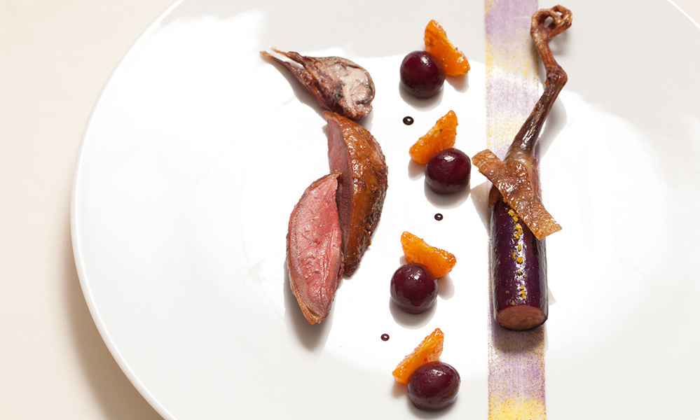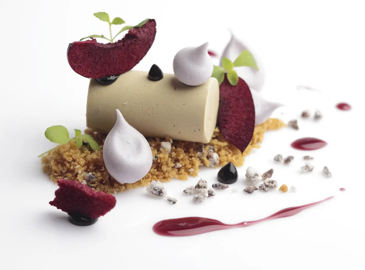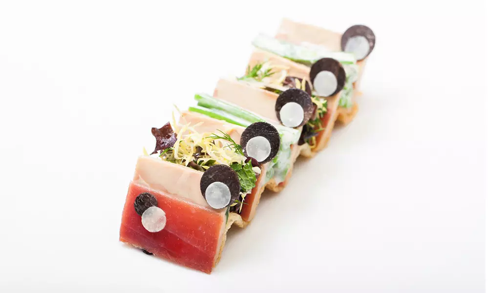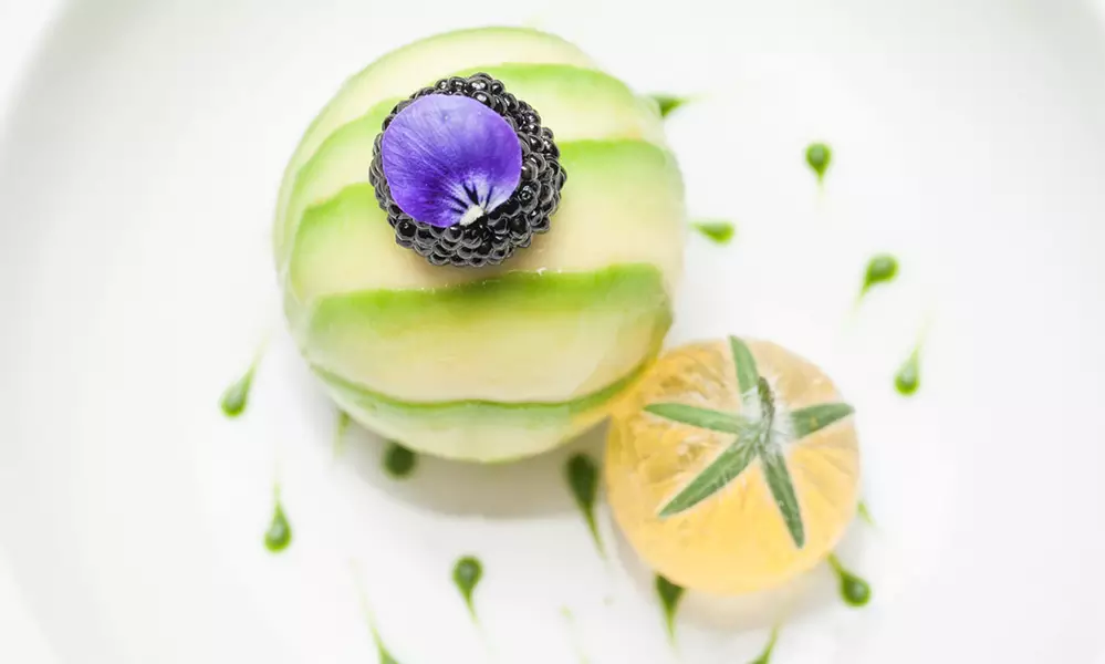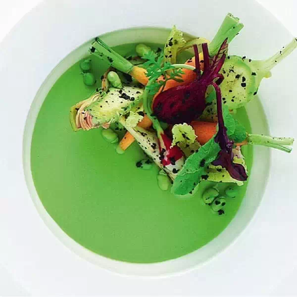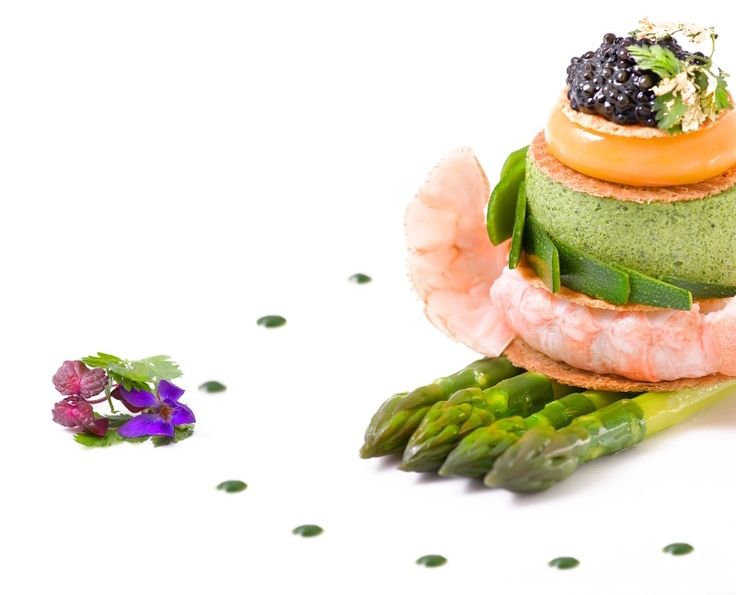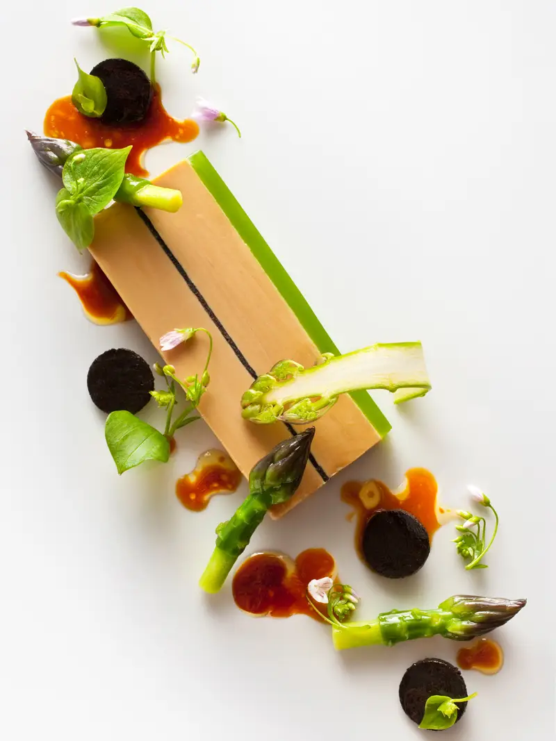 绿色酱汁打底,点缀红萝卜、紫洋蓟、碗豆等春季蔬菜的鲜艳色泽,5:5的精致比例,在视觉上完美平衡。最后再撒上黑松露,Bingo上桌!