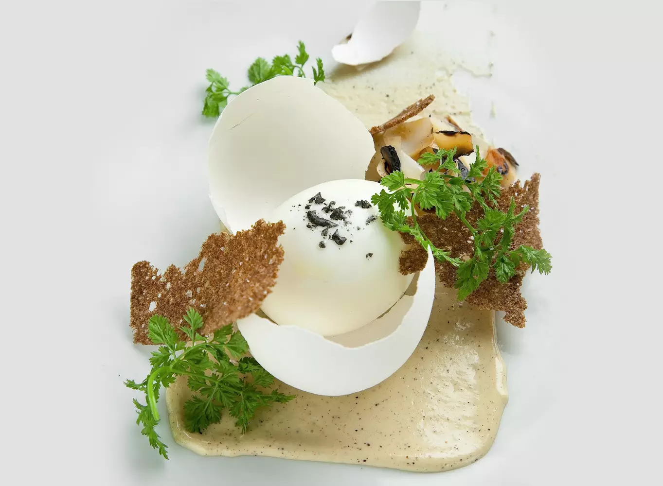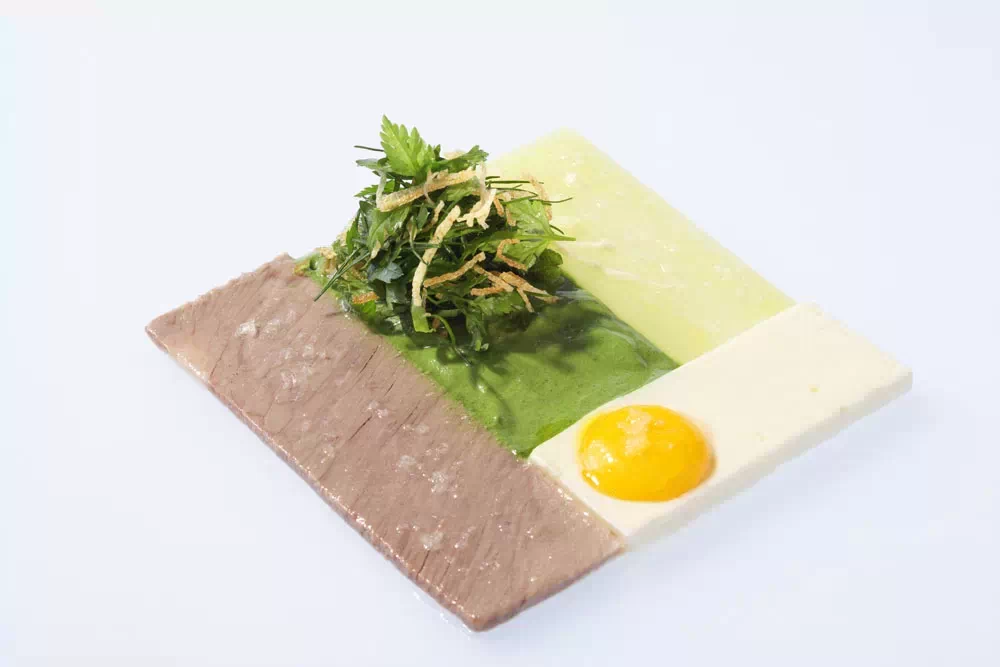 黄色的蛋芯,黑色的松露,最下层是诱人的鞑靼牛肉,对比鲜明的色彩,完美同心圆,强迫症患者的福音。