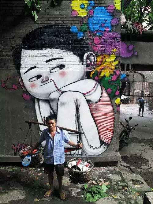 先看看他在上海的作品以及被破坏后的景象: