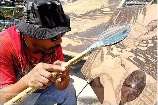 这位菲律宾艺术家Jordan Mang-osan用放大镜作画,他是拿着放大镜聚焦烧灼木板和纸张,通过时间温度撑控烧灼点的颜色深浅来作画,一幅画往往要烧灼好几个月才能完成,菲律宾是个热带国家,雨季较长,所以,他的放大镜作品更显弥足珍贵。