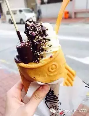 在美女如云的梨大附近,有一个十分特别的冰淇淋小摊,创意十足地将鲷鱼烧与冰淇淋结合在一起,制成可爱逗趣、冰凉甜蜜的“大胃鲷鱼烧冰淇淋”。用蛋卷制成的 鲷鱼烧造型外皮内,塞有满满的酸奶冰淇淋、裹着巧克力外皮的水果串,另外还可从奶油、红豆、红薯泥中任选一款配去其中。