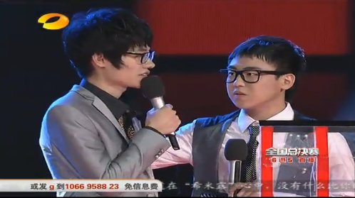 所以我在这里并不是以主持人的身份命令你收回自己的决定,只是给你这样一个建议,我个人觉得,这样才是对刘心真正的支持和尊重,因为有可能你获胜还会带着他的梦想。而且还有一点我也想特别说,我前几天读过一首诗,其中有一句话我特别感动,他说花不全然开放在春天,所以快乐和音乐也不全然在快乐男声的舞台上,不管是谁离开或者是留下,因为给你们带来的快乐都永远存留在你们的梦想当中,所以,行亮希望你能重新做决定。
