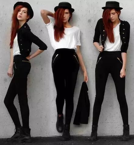 黑色拉链瘦腿裤搭配酷酷的马丁靴帅气十足,白色的T干净明亮配上黑色紧身短裤小毛衫实用保暖。