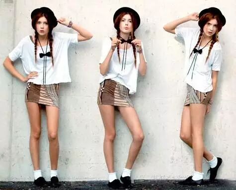 棕色的条纹短裙露出修长的双腿脚上的黑色皮鞋配白色棉袜穿法充满了英伦气息。白色的T简单随意。