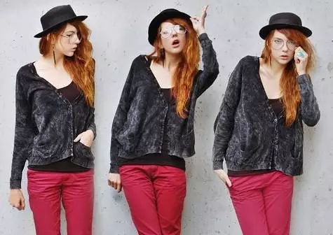 红色的瘦腿裤配上黑色的上装十分经典。灰色的衫宽松的款式带来一抹随意的感觉。