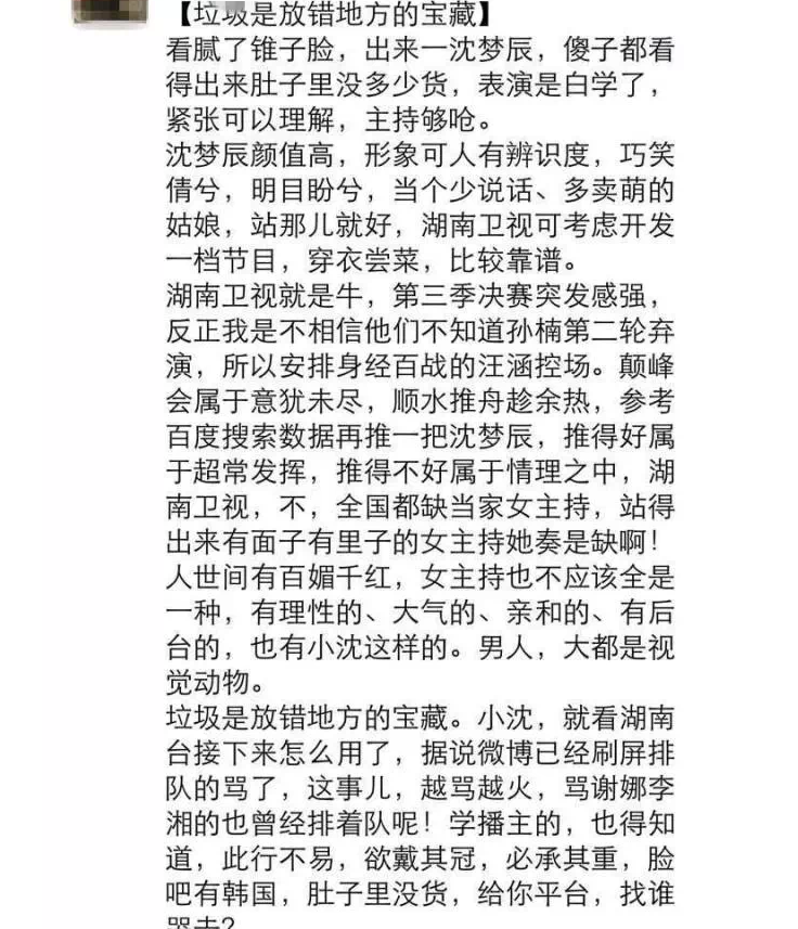 “#沈梦辰# 芒果台最不缺主持人,凭什么沈梦辰能挑大梁?2009年进入湖南台到现在6年时间,她真的不算新晋主持。熬到现在,不管什么方式,她成名了。与其临渊羡鱼,不如退而结网。或许你以后也会踏入电视圈,但,嚼舌根吐槽肯定不是你该有的姿态。”