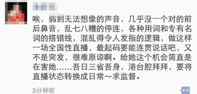 “她的要破不破的嗓子,还有前后鼻音没有一个对,乱七八糟的停连。奇怪的咬字。还有乱七八糟的逻辑,我一瞬间觉得谢娜最起码能连贯说话。只能说,芒果台确实与众不同。不按常理来。” .png)