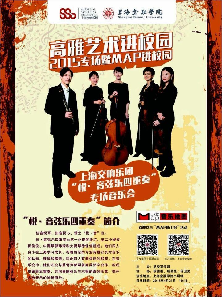 1、关注学校官方微信“微观金院”,并于4月16日(本周四)、4月17日(本周五)、4月18日(本周六)20:00——22:00 将“赠VIP票 |上海交响乐团“悦•音弦乐四重奏”专场音乐会 演出通告”(即本条信息)分享至朋友圈,将分享后的朋友圈截屏图片回复给“微观金院”微信帐号,并留言“求VIP票+您的姓名+学习或工作单位、院系”,在以上三个有效时间段内分别按要求回复的前40位师生索票有效,共计赠票120张。每个微信帐号只可赠票一张,凭收到的取票通知取票。