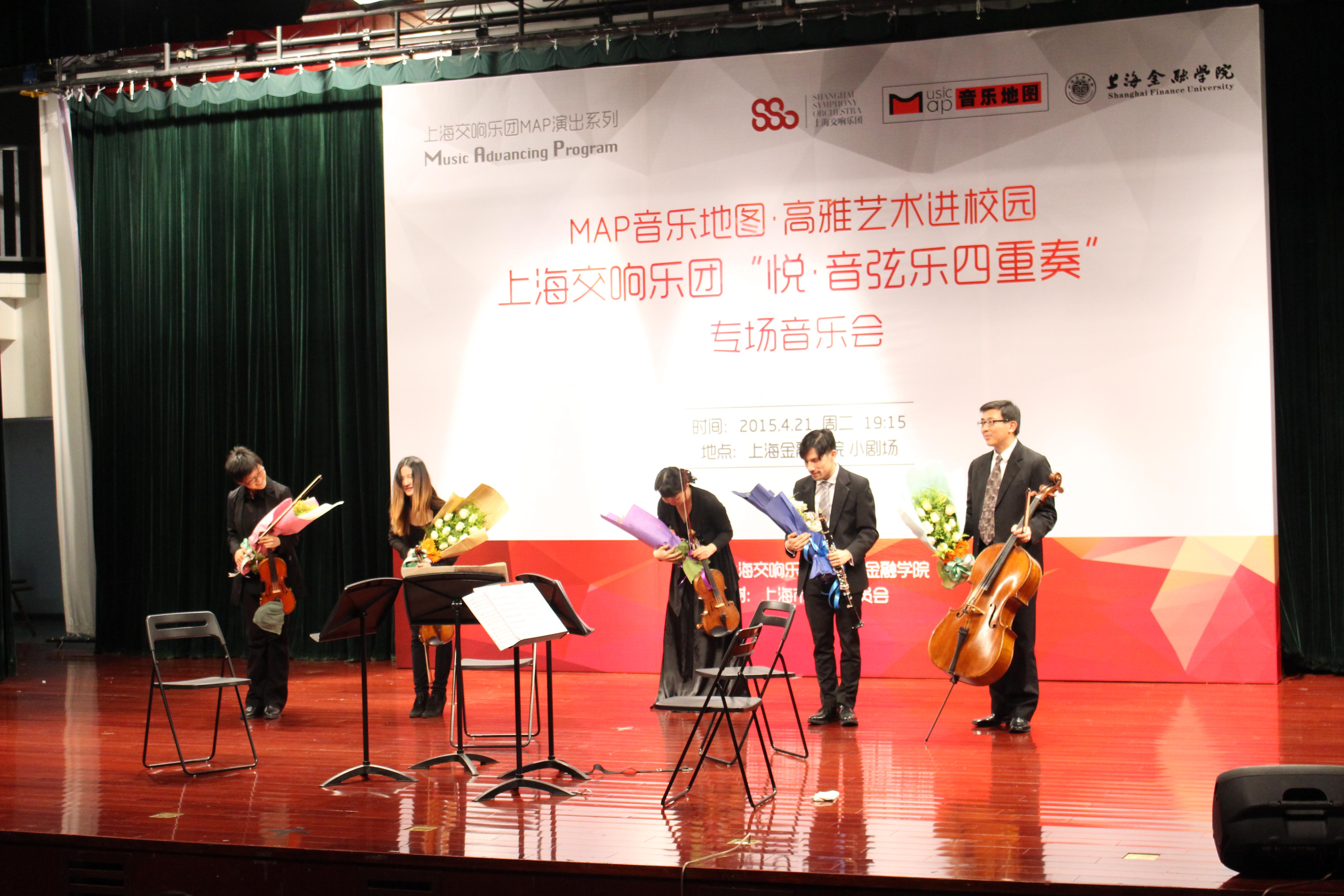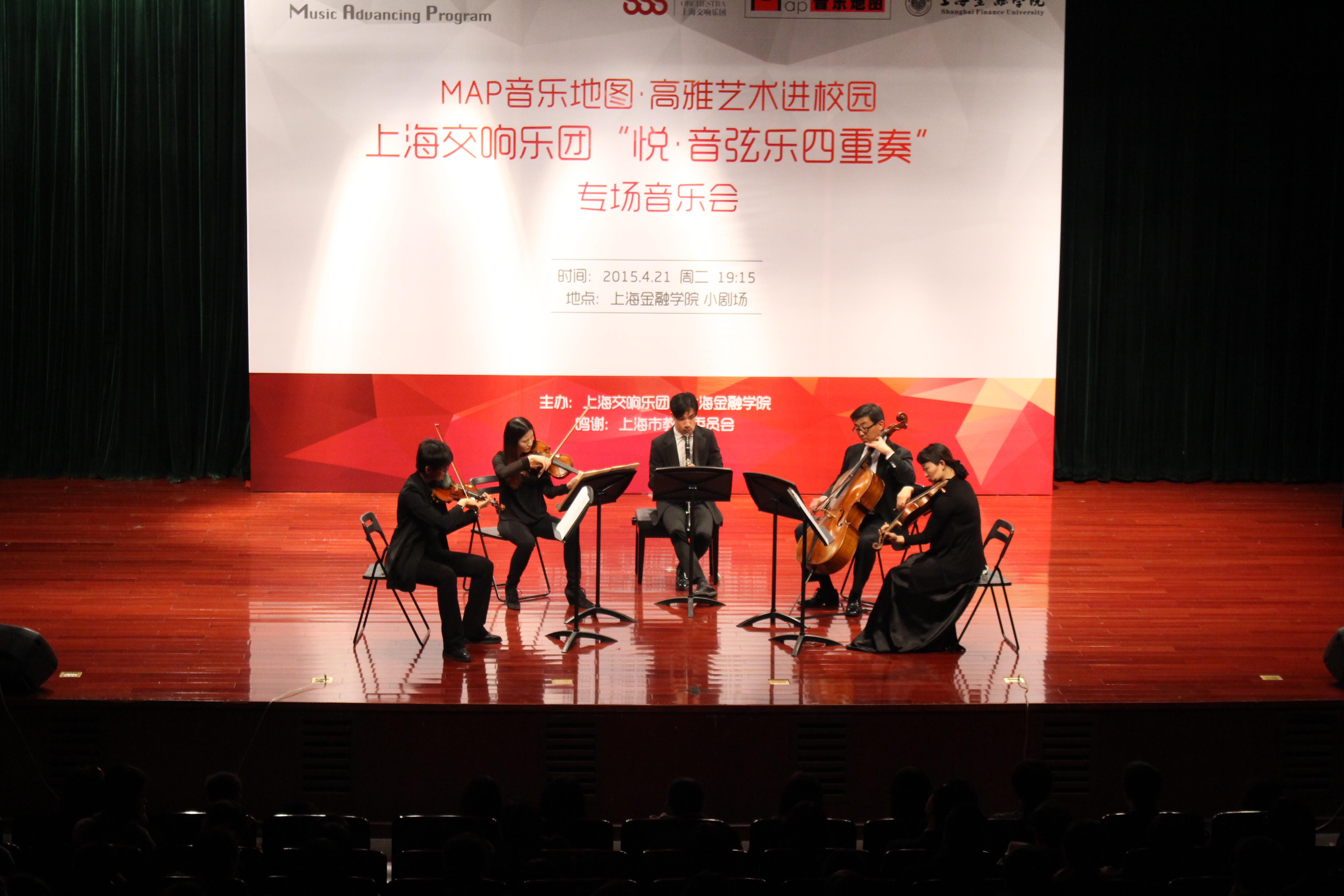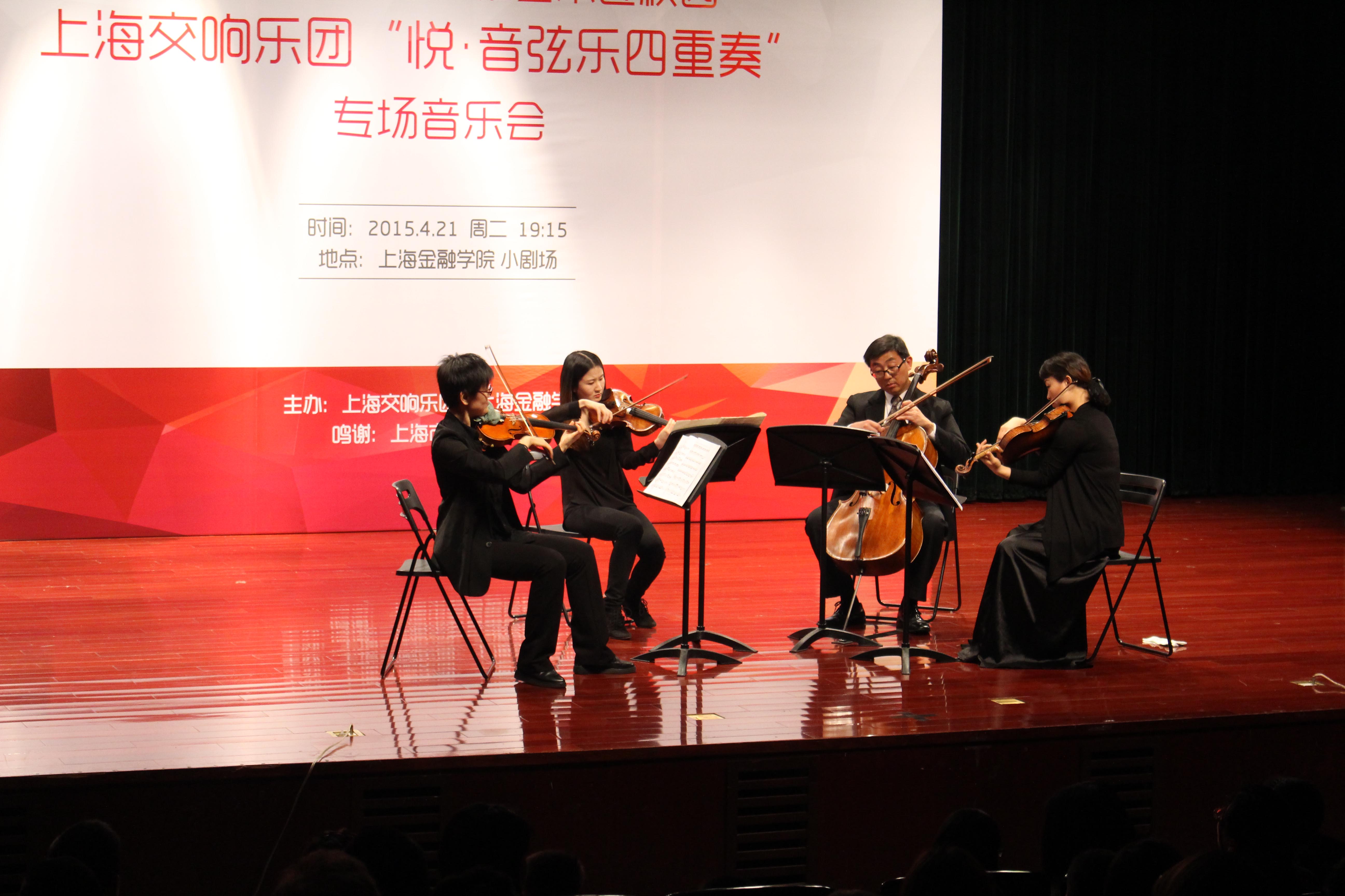 4月21日19:15,我校学生活动中心小剧场奏响了弦乐和木管的奇妙乐章。上海交响乐团“悦·音弦乐四重奏”专场音乐会顺利举行,本次音乐会由上海金融学院党委宣传部主办,校团委、后勤处、保卫处协办,鸣谢上海金融学院大学生艺术团。