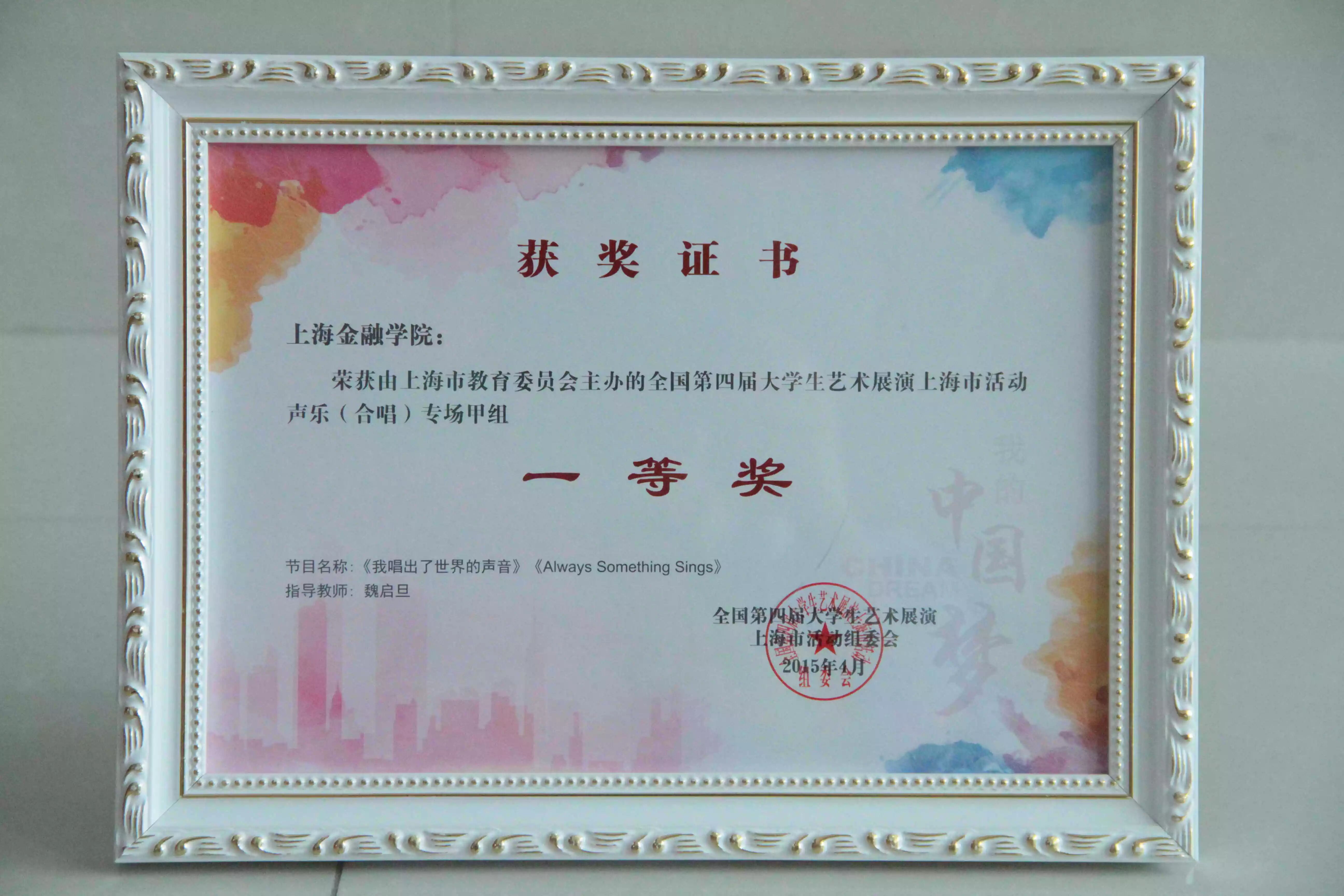 合唱《我唱出了世界的声音》《Always Something Sings》荣获全国第四届大学生艺术展演声乐专场中甲组合唱一等奖,指导教师:魏启旦