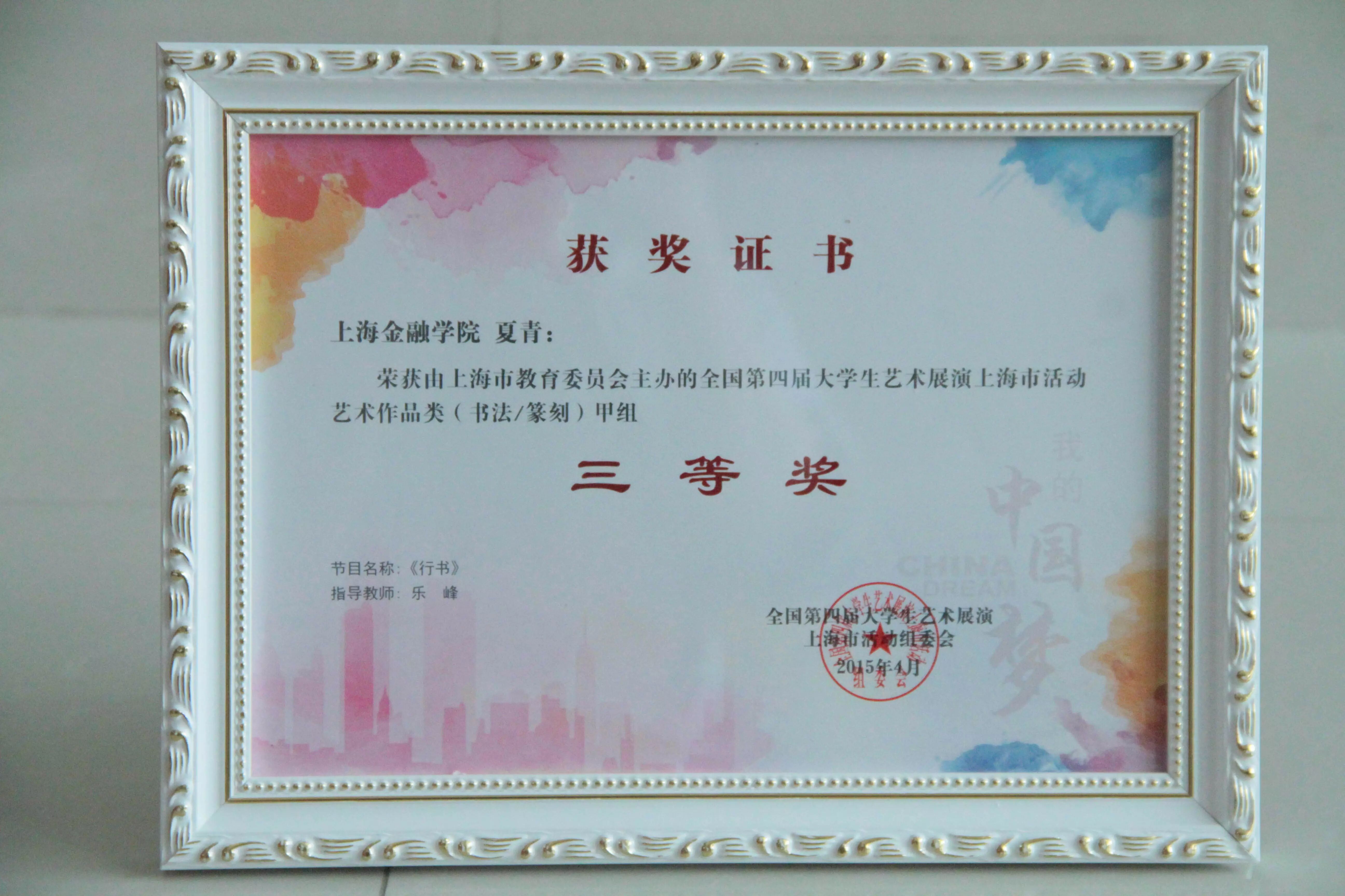 夏青的《行书》荣获全国第四届大学生艺术展演书法篆刻中甲组三等奖,指导教师:乐峰