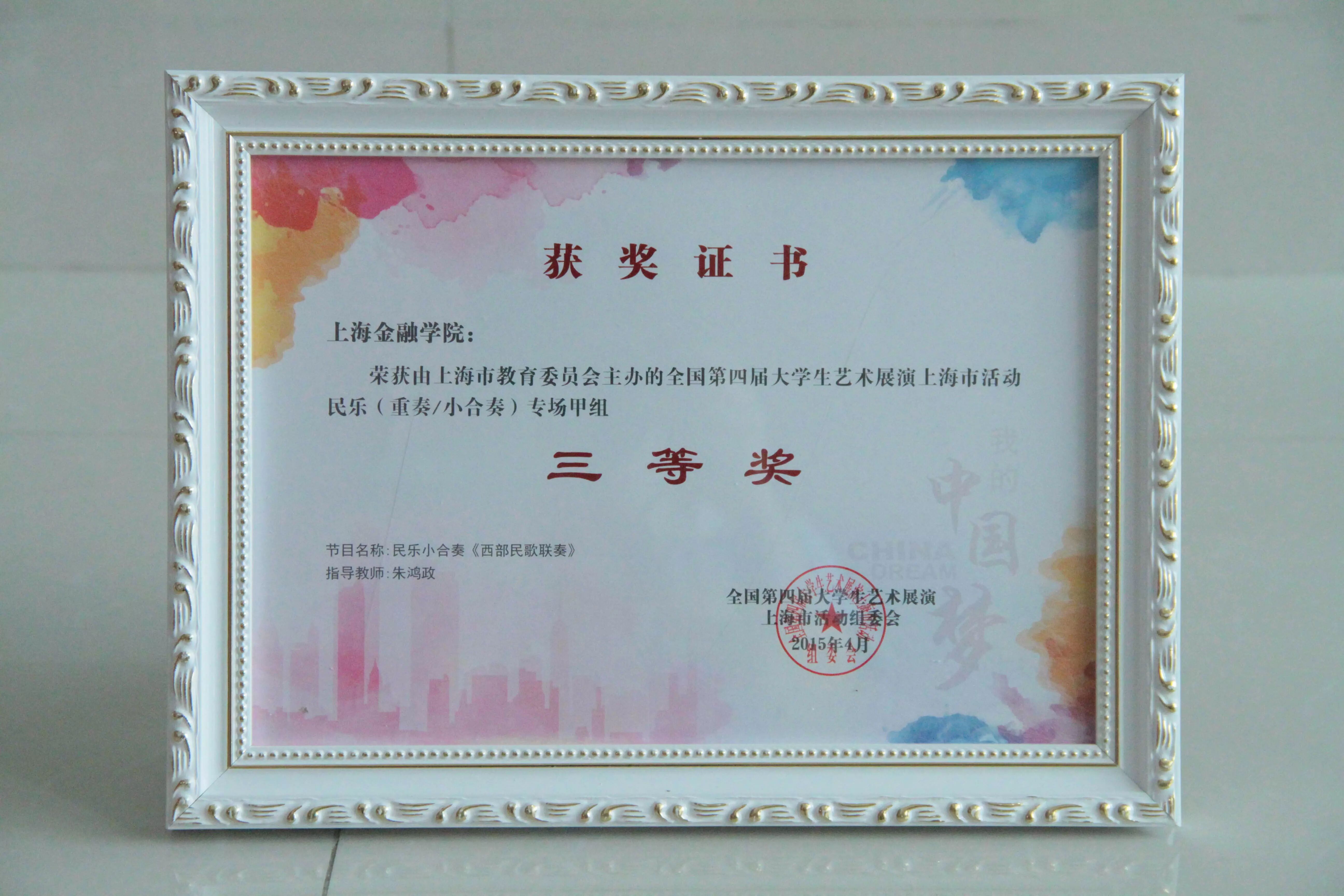 民乐小合奏《西部民歌联奏》荣获全国第四届大学生艺术展演民乐专场中甲组重奏/小合奏三等奖,指导教师:朱鸿政