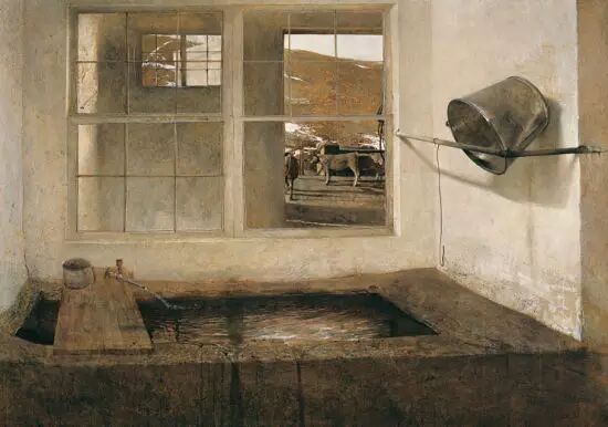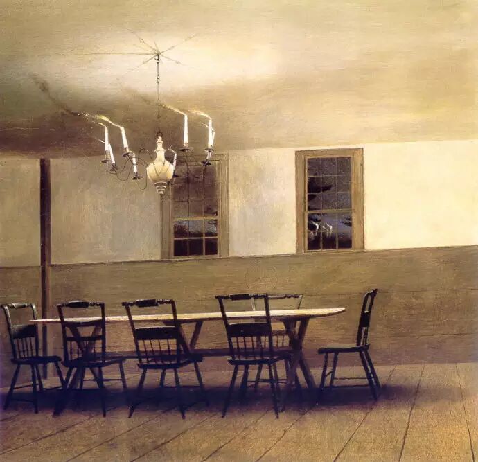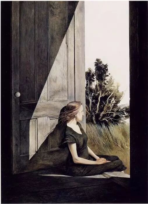 安德鲁·怀斯的作品安静清透,安德鲁·怀斯的世界里,阳光清洁,没有灰尘,原野很辽阔。作者性格也是十分静谧,可以被视为一个虔诚的圣徒,把绘画当成一种宗教仪式虔诚对待。怀斯的画里就很少有熙熙攘攘的喧嚣。他的画里有很少有很多人。有人的画,基本上是一名老人,或是一名妇女在屋子里、阁楼上或阳台前、旷野上静静地坐着或卧着,女孩青春期怅惘地默立或静静沉思。
