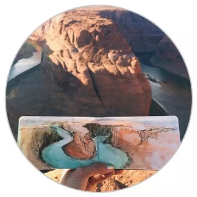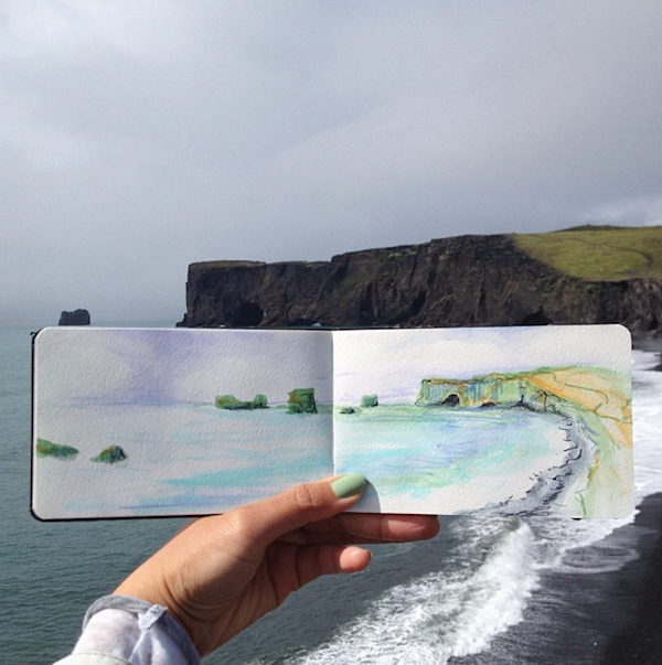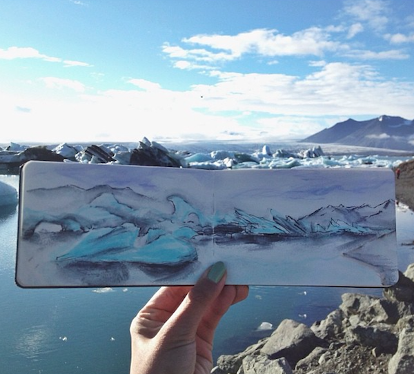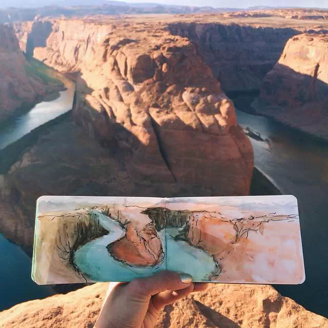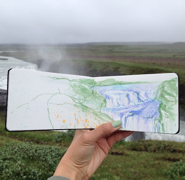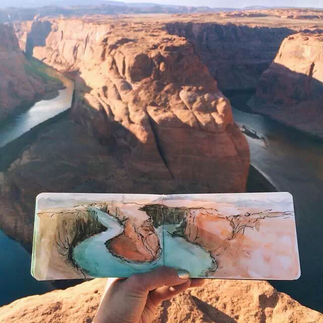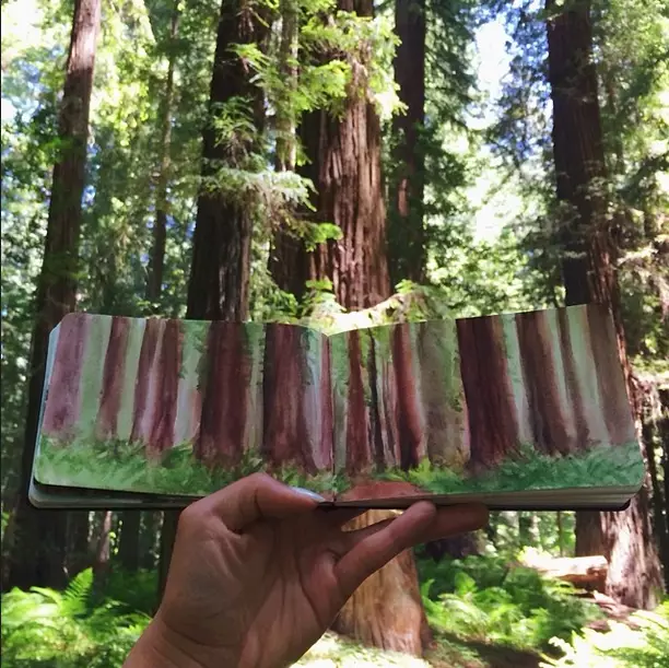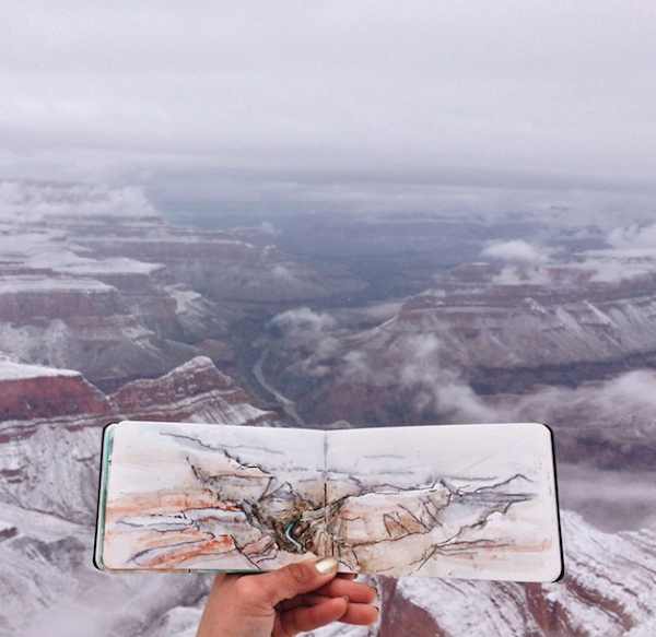 时常将所到之处的风景刻划在自己的画本里,不过不同于其他人的是,她同时也会把自然界的物质带入自己的画作中。