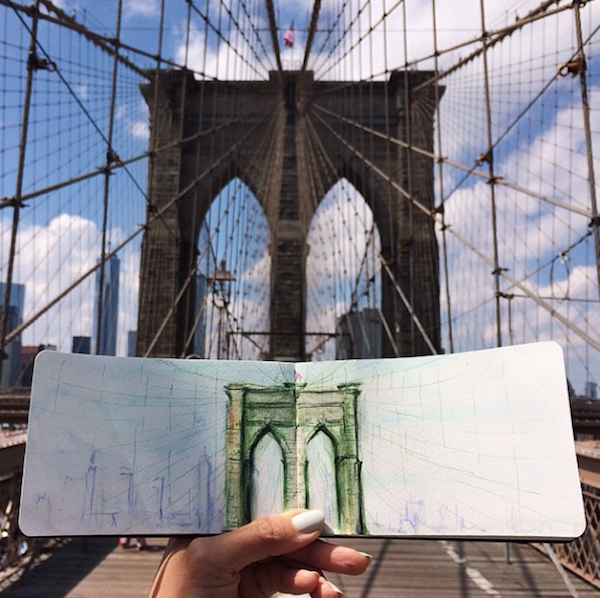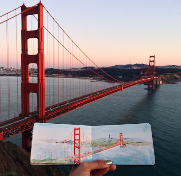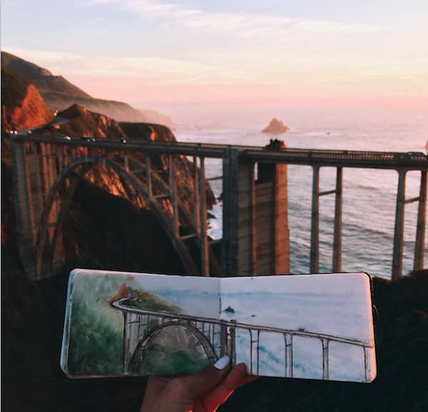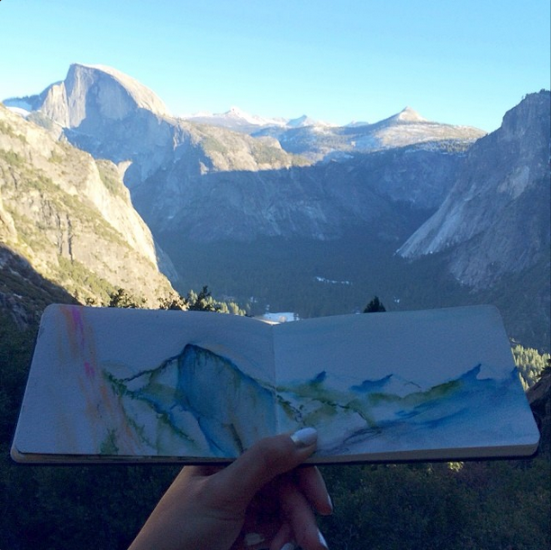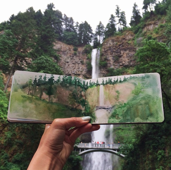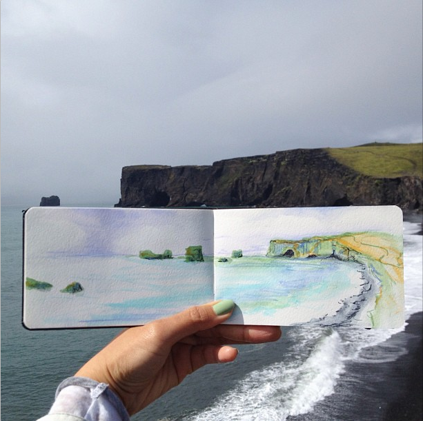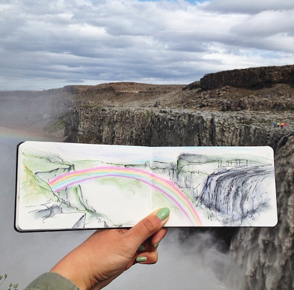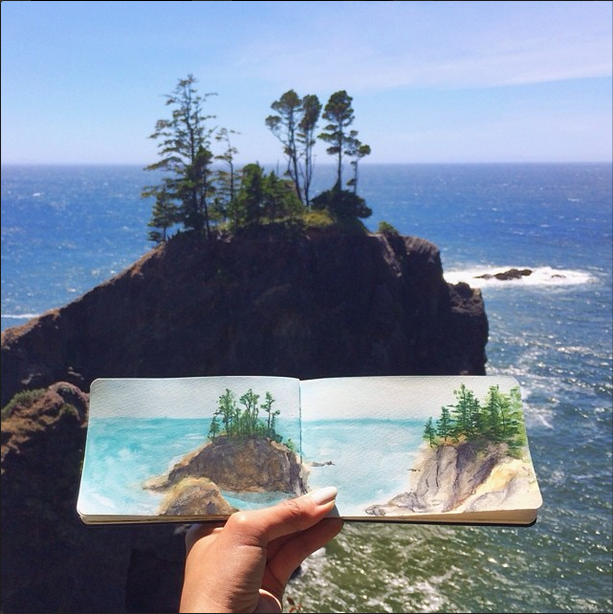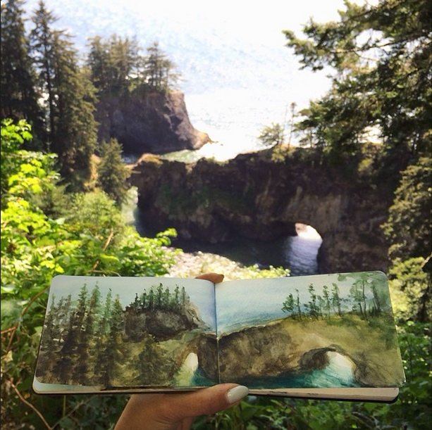 时常将所到之处的风景刻划在自己的画本里,不过不同于其他人的是,她同时也会把自然界的物质带入自己的画作中。