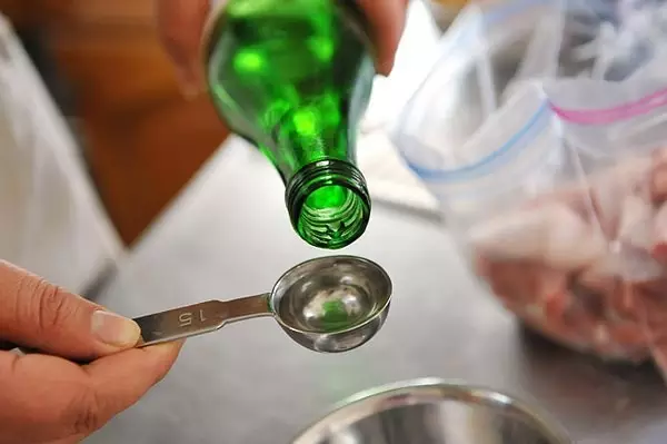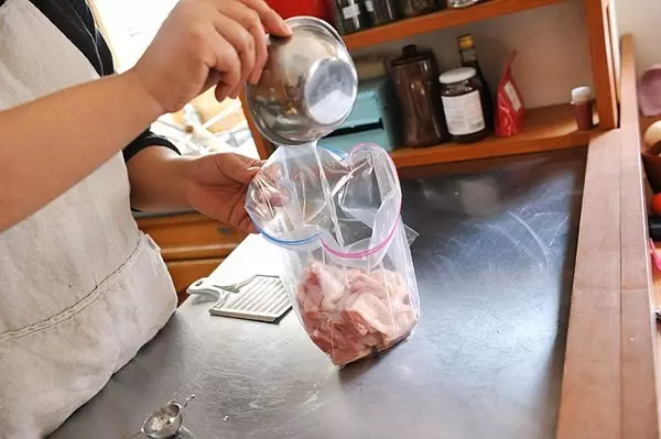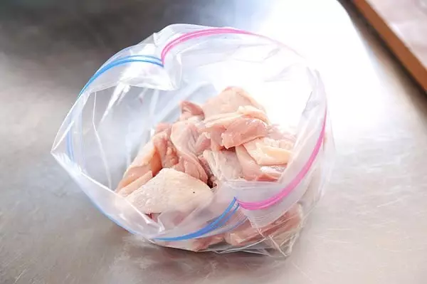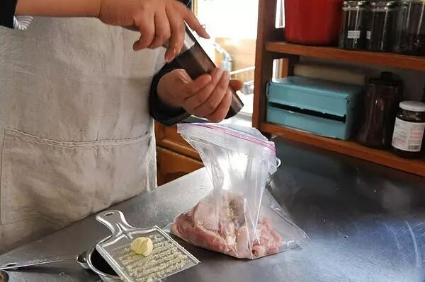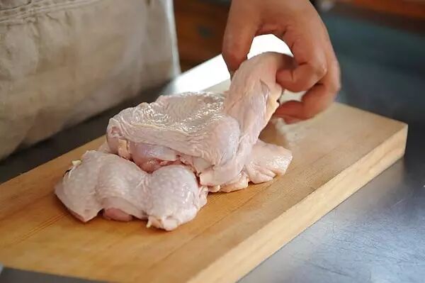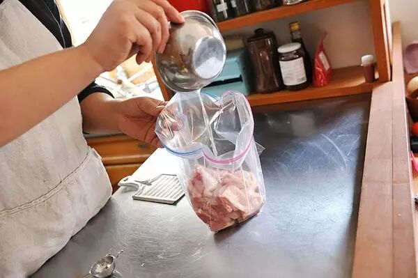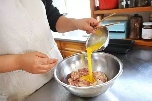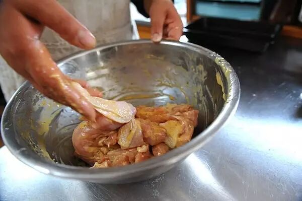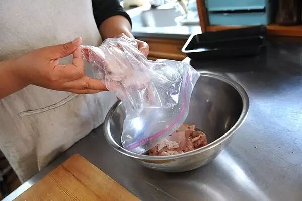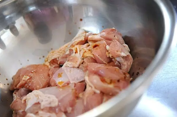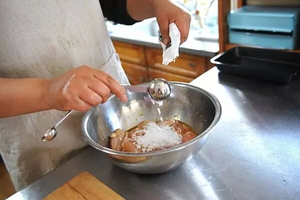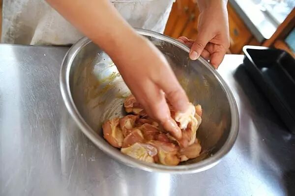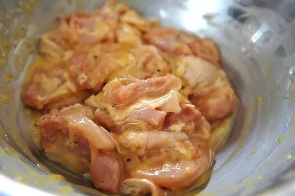 接下来料理进入后半段了。把腌好的鸡腿肉放进碗里