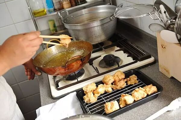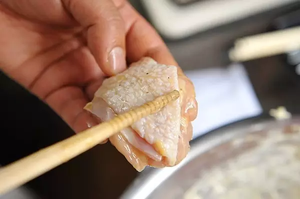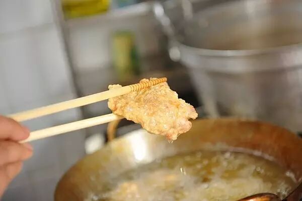 因为想要把皮炸脆,所以要一块一块,用筷子像是为了让“皮和肉紧紧贴在一起“那样抻鸡皮,这样的话,做好的口感会大大提高