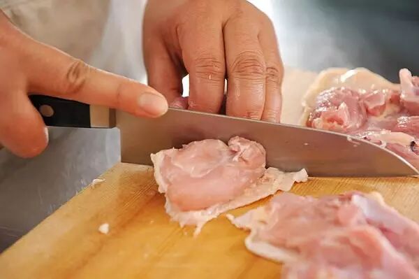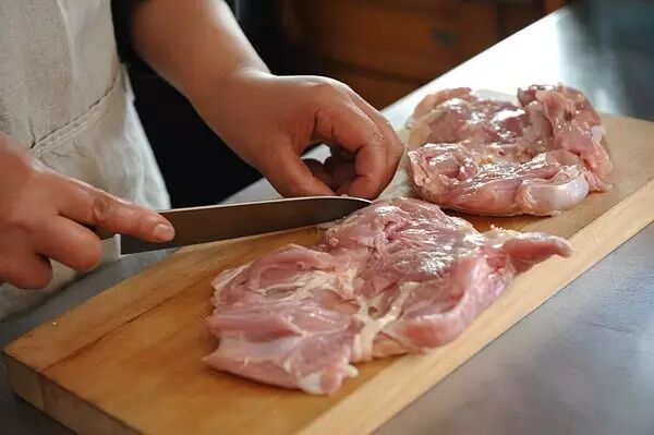 切开之前饭岛桑先做了点儿细活儿 [多余的脂肪、要去掉噢] 原来如此 去掉鸡的脂肪 才不会那么油腻。