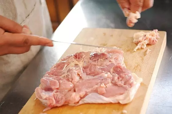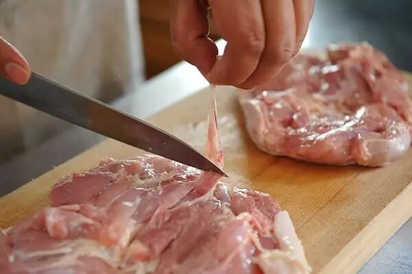 为了做出特别好吃的炸鸡,像这样的「清扫」(指上一步剔除可见脂肪血块等)是非常重要的。但是不做也没关系。即使这样也已经足够美味了。