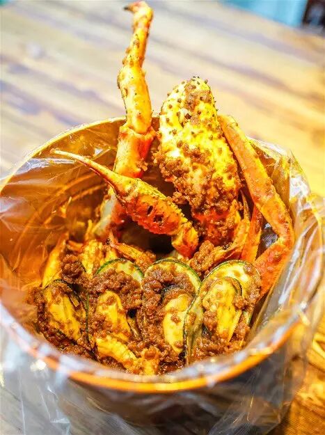 巨蟹桶是必点项!新鲜量大,里面不仅有蟹腿,还有虾贝类还有鱿鱼玉米土豆等,吃起来也是蛮爽的,绝对管饱~而且吃起来也很方便,因为店员会帮着把蟹腿都剪开的。