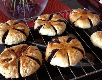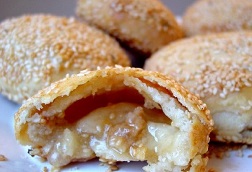 上海久负盛名的特色点心,创始于20世纪20年代初期,它采用油酥面加酵面制坯,做成扁圆形饼,饼面粘上一层芝麻,贴在炉壁上经烘制而成。馅料有咸有甜,咸的有葱油、鲜肉、蟹粉、虾仁等,甜的有白糖、玫瑰、豆沙、枣泥等。因饼形似蟹壳,熟后色泽如蟹壳背一样深红,所以称为"蟹壳黄"。