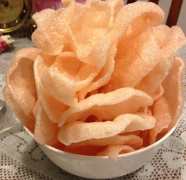 白白脆脆的,有一股子鱼虾鲜味,最讨小孩子喜欢。上海龙虾片是用鲜鱼肉掺淀粉及调味料经蒸熟后冷却切片,干燥所得到的制品。