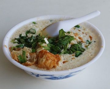 咸豆浆之于上海人,就如胡辣汤之于河南人,豆汁儿之于北京人,是永存记忆中的一抹温暖色彩。宽口浅底的蓝边大碗里,一勺酱油一勺醋,一撮榨菜一撮葱,讲究的再搁点紫菜虾皮。豆浆烧得滚烫,功夫好的老师傅,舀上一大勺,乳白的热豆浆飞流直下,倾入碗中,瞬间起花。一碟炸得焦脆的油条,切寸许,即泡即食。