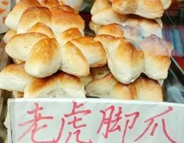 因正面突起六个尖状物,颜色呈焦黄,由于是手工制作不用模具,六个角时常分得很开,形状类似老虎的爪子老虎脚爪表面脆而不硬,稍显坚实是其特色,还有略一点点碱香味,用老面发酵的传统方法制作,据说可以帮助消化。以前胃病患者胃痛起来,都要买老虎脚爪吃。