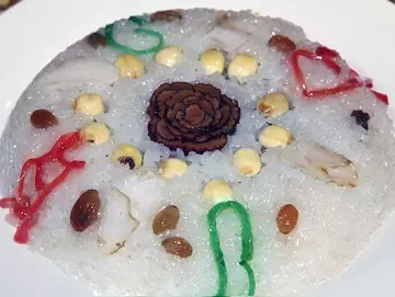 上海八宝饭是一道传统中的经典点心,传统的做法是用猪油拌糯米饭,以重油、重糖、色艳、香浓、软糯而闻名用橄榄油代替了猪油,少了油腻感,增加了橄榄油的清香味,里面的馅料豆沙也自己动手用橄榄油制成的。