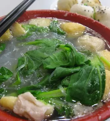 油豆腐粉丝汤是很有特色的上海特色小吃。创始于20世纪20年代初期,最早由小吃食摊经营者,价廉物美,颇受广大消费者喜爱。虽然它看上去有点清汤寡水,但看它的烧制过程却算是一种享受:锅内汤汁翻滚,煮着铁丝网勺里的线粉,闻一闻,香气四溢。