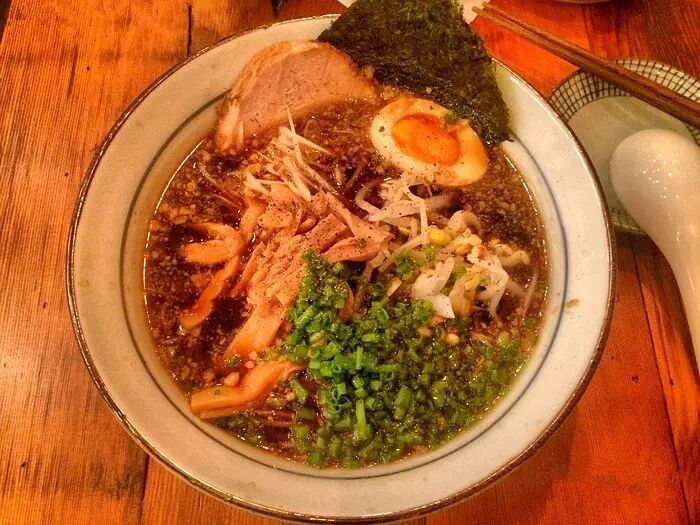 陕西南路上小小的门面,一不小心就会错过。老板是上海人,大厨却是日本来的,很小的店面,分为上下层。一楼隔着走道分为两边,一边双人座另一边则是吧台座,吧台可以看到全透明玻璃窗的厨房。菜单只有一页纸,看起来简洁明了。特制黑玉东京酱油拉面是黑米做的,浓郁的汤头配上叉烧、溏心蛋,一下子就被治愈了呢!