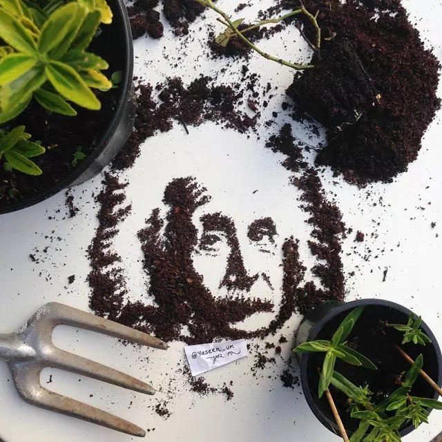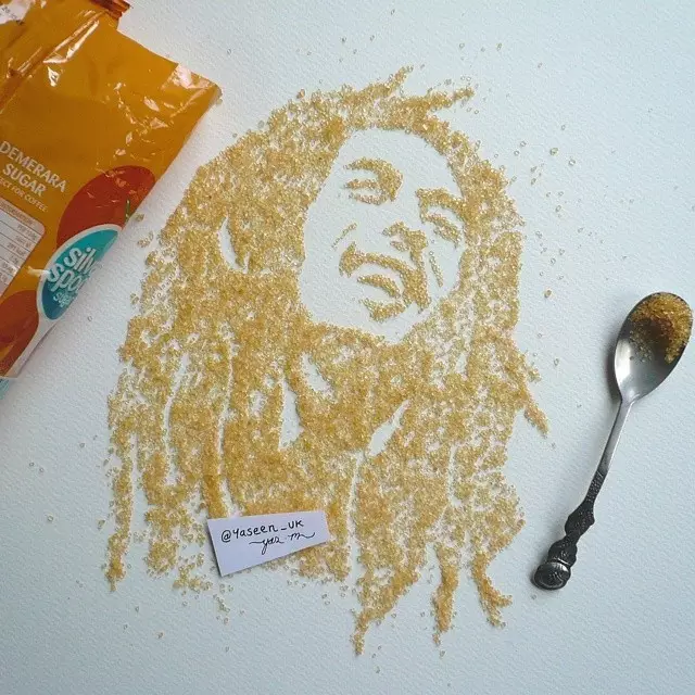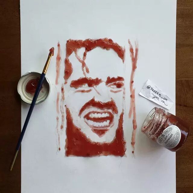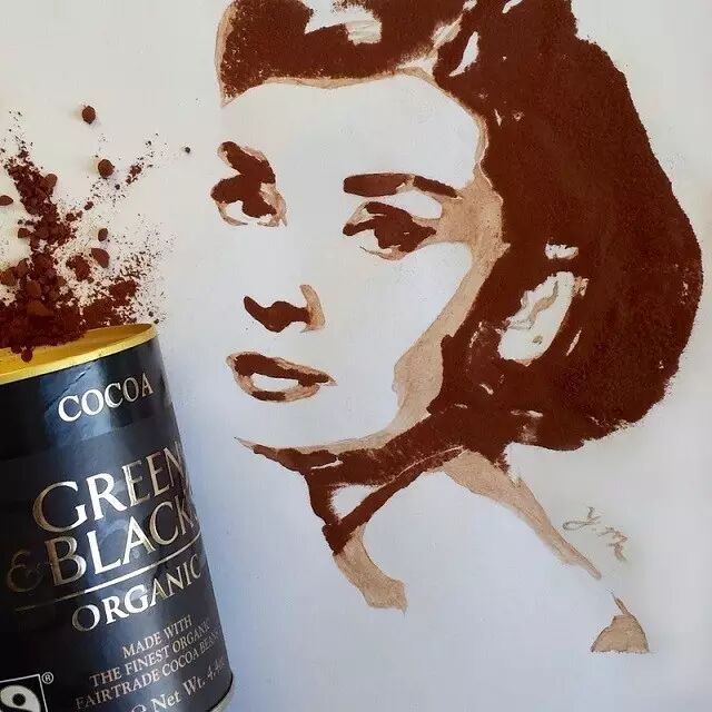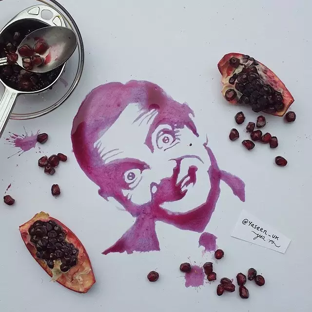 他擅于用自己的绘画天赋将随处可见的食品演绎成惟妙惟肖的名人肖像。比如,亚辛用半脱脂牛奶和一支吸管画出迈克尔•杰克逊的肖像,把石榴果汁涂抹成“憨豆先生”的招牌表情,还用可可饮料描绘奥黛丽•赫本的端庄优雅。他甚至还把英国女王伊丽莎白二世的侧面像雕刻在“奥利奥”饼干的奶油夹心里。