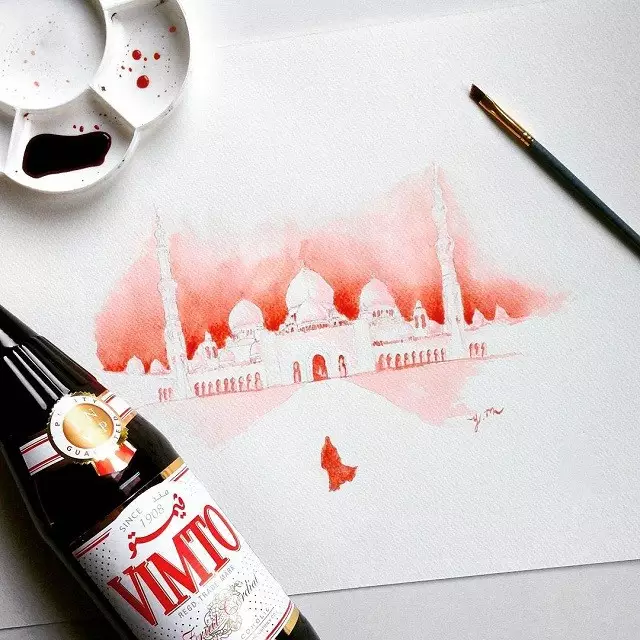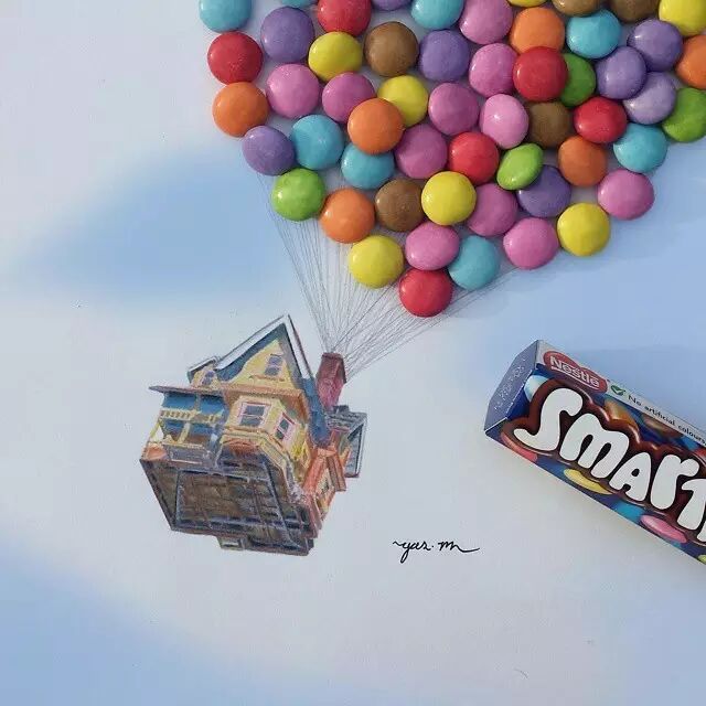 Yaseen 的创意不仅限于画名人肖像,他也尝试过手绘和食品相结合的作画方式。他用彩色铅笔和巧克力豆画出的动画片《飞屋环游记》中飞行的小屋,奇思妙想令人叹为观止。
