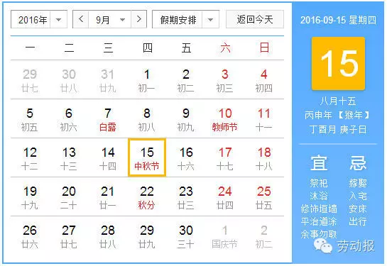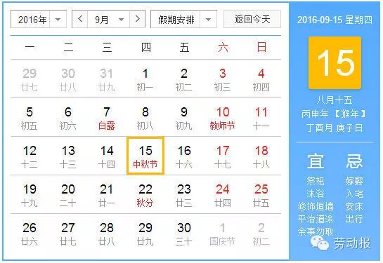 9月15日(星期四,农历中秋节当日)为国家法定节假日