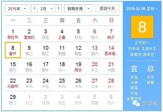 2月7日(星期日,农历除夕)、2月8日(星期一,农历正月初一)、2月9日(星期二,农历正月初二)为法定节假日