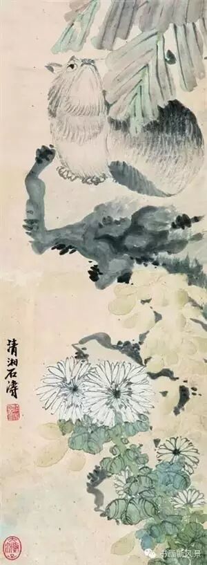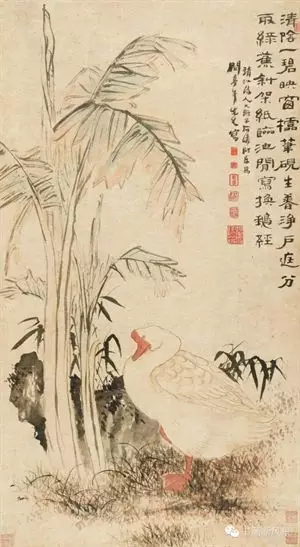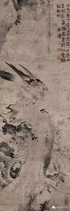石涛的《鹤寿千春图》是一件汇集诗、书、画三绝的上乘佳作。《鹤寿千春图》简洁、奇特的构图,除了一鹤一桃之外,不置任何衬景,既鲜明的突出了主题,又集中的冲击了观看者的视觉。大笔一挥而就,不多渲染,痛快淋漓,这正是石涛的独特风格!再看这鹤与桃,一大一小、一上一下、一俯一仰、一动一静,形成了强烈的对比,丹顶鹤微展双翅,俯身低头,二眸凝视着下方的蟠桃,而这枚连枝带叶的桃子也似有灵通,仰面努嘴,甚至伸出双臂样的枝槎,在打招呼,如长幼之关怀,似亲人之抚爱,像友朋之倾谈,意趣盎然。画的上方,洋洋洒洒,一篇长诗,占去了三分之一的空间,在石涛数以百计的诗作当中,众体皆备,但尤擅古体歌行。这里题的诗就是一首“七古”。共有二十四句,以七字为主,中有“君不见”和“又不见”插入。用韵宽泛不拘,平、去、入随句灵活运用,自然和谐,如歌如述,声情并茂。画意未尽,由诗阐发,而读诗之时,又不能不注意到迎头盖脸的题字书法了。从视觉效果上看,它的份量当与图画平分秋色,这就是石涛书法的魅力!众所周知,他的书法出入汉魏,尤其倾慕元季高士倪云林的遒媚古劲的风致,然而由于他的性格和艺术主张的原因,便又参照了徐文长的放浪恣肆的态势,形成了自己独特的精神面貌。疏疏密密的行间,大大小小的字体,深深浅浅的笔墨,跌跌宕宕的神态,长长短短的句式,与全图构成了一个浑融、灵动,意趣横生的统一体。总之,只有此画、此字、此诗,才能称为石涛、才能称为“三绝”!