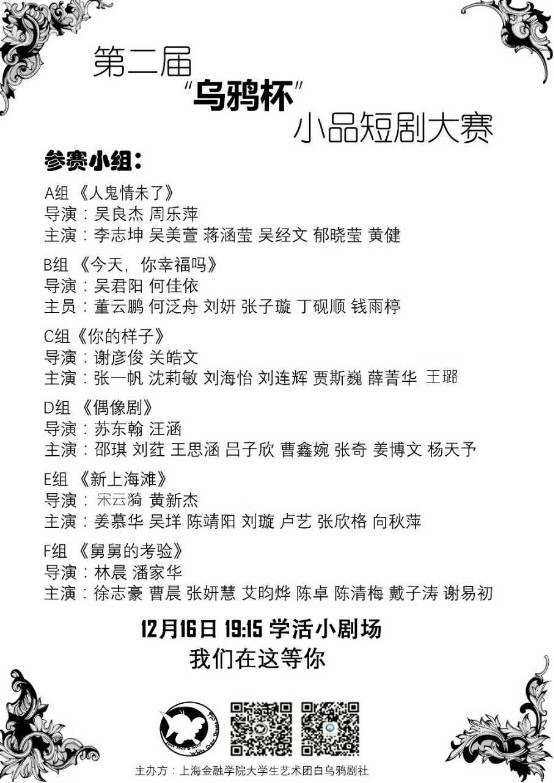 好的在这段庄重又不失活(biao)泼(lian)的开头后,让我们进入正题!从来不怂的主页君郑重向全世界宣布:第二届“乌鸦杯”小品短剧大赛将于12月16日晚19:15在小剧场隆重举行!