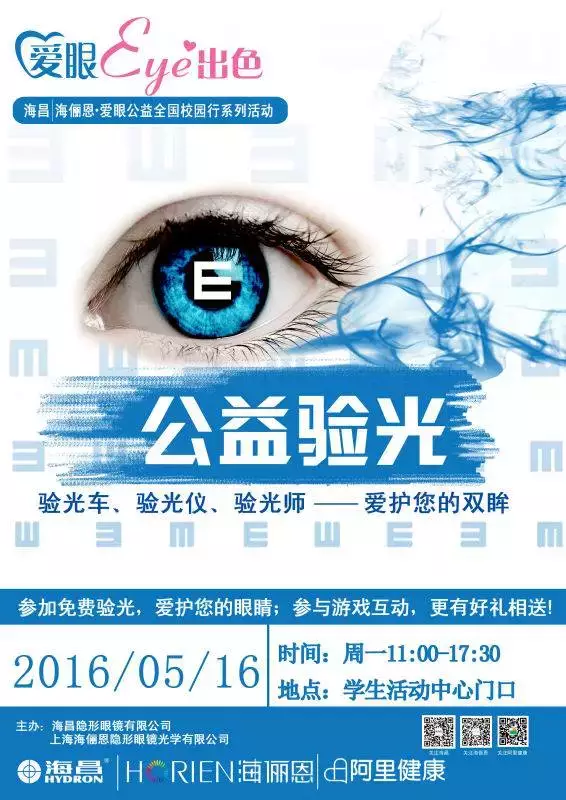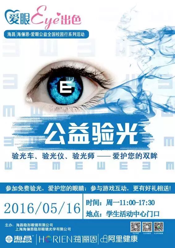 别担心,这些问题海昌为你一一解决。为回馈粉丝们,海昌隐形眼镜有限公司携手姊妹品牌海俪恩将于5月16日将在上海金融学院学生活动中心门口(11:00—17:30),五教114(18:30—20:30)举行“爱眼·EYe出色”公益校园行活动。外场由海昌海俪恩的专业事务部团队免费为大学生提供验光以及视力检查服务,内场由知名彩妆师Apple老师讲解彩片和彩妆的搭配,并由海昌专业验光讲师讲解配戴隐形眼镜的知识和技巧。凡参与现场活动的,即享4重好礼~